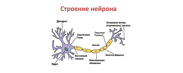 Нейроны – основные структурные и функциональные единицы нервной системы – возбудимые клетки, которые способны генерировать и передавать электрические импульсы (потенциалы действия). Каждый нейрон имеет расширенную центральную часть: тело – сому и отростки – дендриты и аксоны. Каждый нейрон имеет только 1 аксон, длина которого может достигать от нескольких микрон, до 1,0 – 1,5 метров. Скопление тел нейронов и коротких дендритов, покрытых тонкими оболочками, образуют серое вещество ЦНС, а их отростки (аксоны и дендриты) – белое вещество. Длинный отросток нейрона аксон проводит импульсы от тела нервной клетки к другим клеткам или тканям рабочих органов. Аксоны покрыты миелиновой оболочкой белого цвета, которая выполняет роль изолятора и увеличивает скорость проведения нервных импульсов вдоль мембраны отростков, предотвращает распространение на соседние ткани идущих по волокну нервных импульсов.