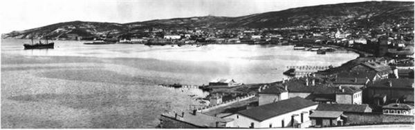 Паровоз пассажирского поезда гудками, перекатывающимся многократным эхом в горах, возвещает о приближении к станции. Поезд ритмично отбивая колёсами стыки рельс катит вдоль извилистой бухты. На рейде стоят крупные военные корабли, привлекая внимание глаз строгостью линий контура. Около пирсов и причалов стоят более мелкие корабли, сгруппированные по классам. Вдали виднеются просторы Чёрного моря. На противоположном берегу бухты открывается город, расположенный амфитеатром на склонах гор.