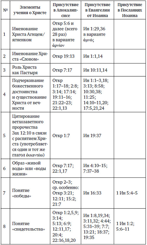 Однако нельзя не заметить и сходства между Евангелием от Иоанна и Апокалипсисом – в частности, в них присутствует целый ряд значимых тематических параллелей. К примеру, оба текста отличаются возвышенным учением о Христе и Его мессианском божественном достоинстве, оба называют Его «Агнцем»/ягненком, «Словом» и Пастырем. Для обоих текстов ключевыми понятиями являются «свидетель»/«свидетельство», «победа», «живая вода», поляризация добра и зла.