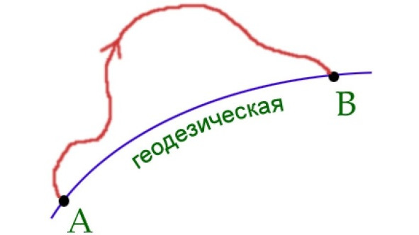 Кратчайший путь из точки A в точку B проходит по геодезической