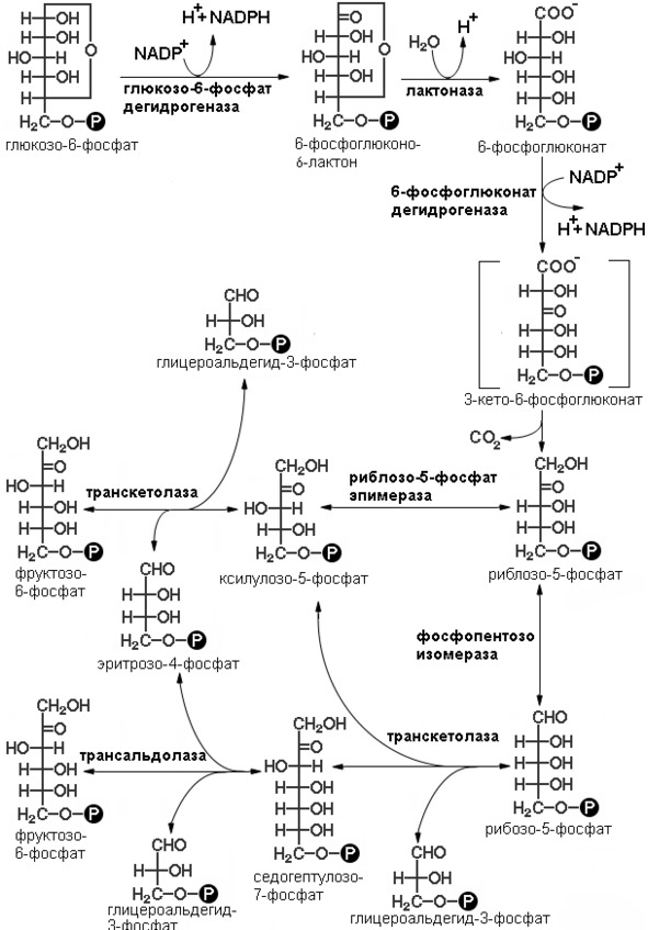 Последовательность реакций пути можно разделить на две фазы: окислительную и неокислительную (схема реакций представлена на рисунке 4). В реакциях первой фазы глюкоза-6-фосфат дегидрогенируется и декарбоксилируется с образованием рибулозо-5-фосфата. В ходе второй фазы рибулозо-5-фосфат превращается снова в глюкозо-6-фосфат в результате серии реакций, в которых главную роль играют два фермента: транскетолаза и трансальдолаза
