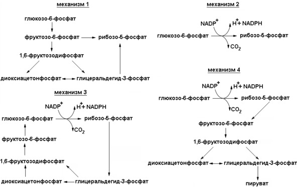 Пентозофосфатный путь является альтернативным путем окисления глюкозы. Он включает несколько этапов, в результате функционирования которых из трех молекул глюкоза-6-фосфата образуются три молекулы СО2 и три молекулы пентоз. Последние используются для регенерации двух молекул глюкозо-6-фосфата и одной молекулы глицеральдегид-3-фосфата. Поскольку из двух молекул глицеральдегид-3-фосфата можно регенерировать молекулу глюкоза-б-фосфата, глюкоза может быть полностью окислена при превращении по пентозофосфатному пути.
