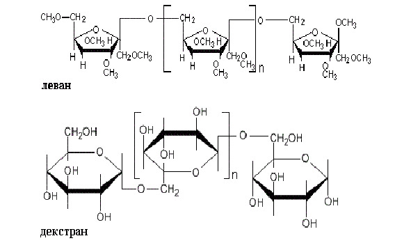 Леван. Запасающий полисахарид Bacillus subtilis. Линейный нередуцирующий гомополисахарид, образованный остатками метилового эфира β D фруктозы, мономеры соединяются 1—6 гликозидной связью. Полимер отличается небольшой длиной 10—12 мономеров.