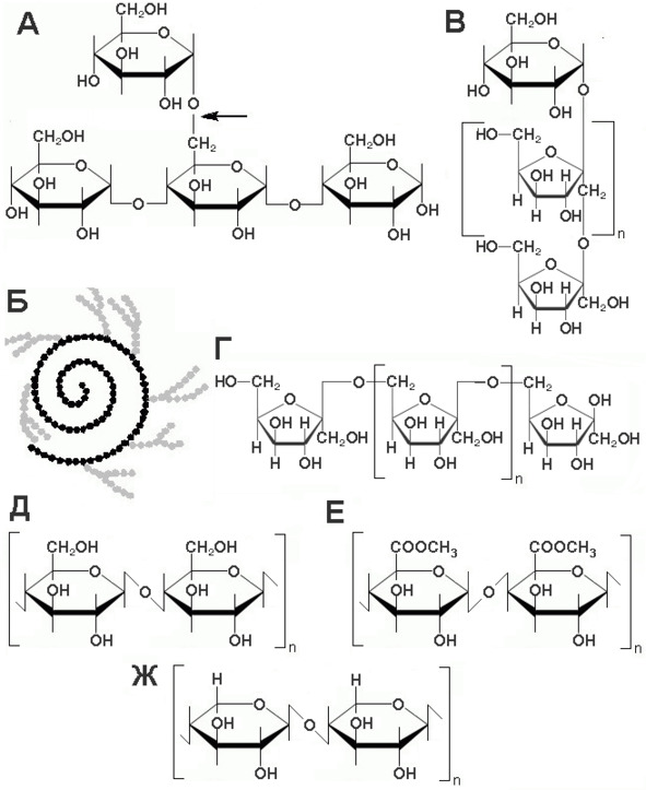 Рисунок 23. Структурные и запасающие полисахариды растений. А-крахмал; Б-схема организации молекулы крахмала; В-инулин; Г-фруктаны; Д-целлюлоза; Е-ксилоза; Ж– пектины