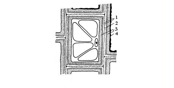 Рисунок 24. Схема строения клеточной стенки растений; 1 – первичная оболочка (два слоя по обе стороны от 2); 2 – срединная пластинка; 3 – слои вторичной оболочки; 4—третичная оболочка
