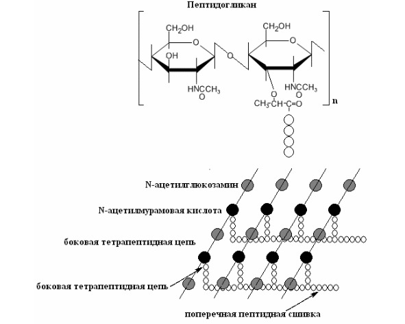 Он состоит из длинных, параллельно расположенных полисахаридных цепей, связанных между собой через определенные интервалы поперечными сшивками из коротких полипептидных цепочек. Полисахаридные цепи состоят из чередующихся моносахаридных остатков N-ацетил-D-глюкозамина и N-ацетилмурамовой кислоты (сложного девятиатомного сахара), соединенных друг с другом β (1 -4) -связями. К каждому остатку N-ацетилмурамовой кислоты присоединена боковая тетрапептидная цепочка, образованная последовательно соединенными L-аланином, D-глутаминовой кислотой, мезо-диаминопимелиновой кислотой, D-аланином. В результате параллельные полисахаридные цепи сшиваются короткими поперечными полипептидными цепочками, структура которых различна у разных видов бактерий. У гноеродных бактерий Staphylococcus aureus, вызывающих развитие фурункулов и нагноение ран, остатки ацетилмурамовой кислоты в соседних полисахаридных цепях связаны друг с другом пептидными цепочками, состоящими из пяти остатков глицина.