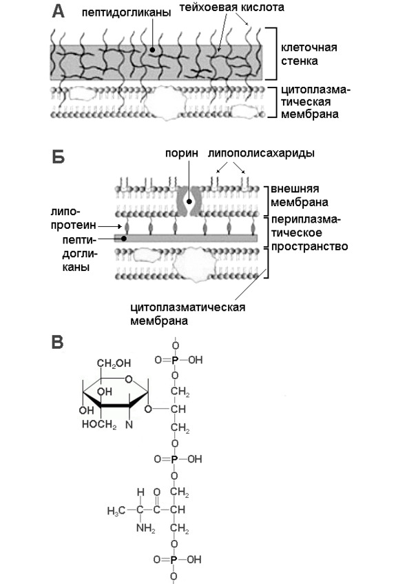 Рисунок 28. Структура клеточных стенок бактерий. А – грамположительных; Б – грамотрицательных. В – Структурная формула глицеринтейхоевой кислоты. Содержит чередующиеся остатки D-аланина и N-ацетилглюкозамина