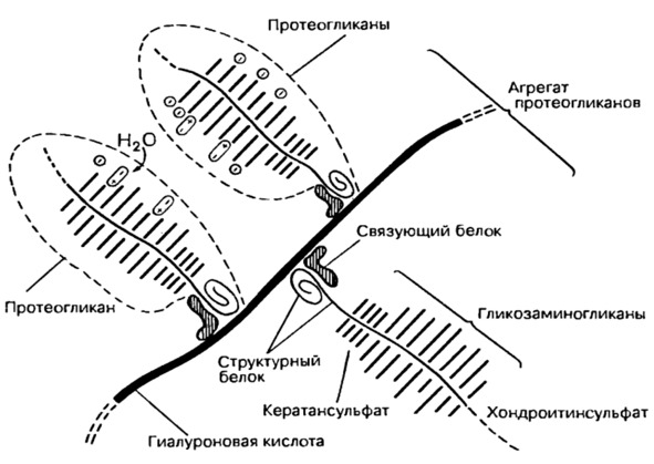 Структурные полисахариды, входящие в состав межклеточного вещества, образуют протеогликаны – белково-углеводные комплексы, где белок составляет около 10%. Типичный протеогликан хрящевой ткани содержит около 150 полисахаридных цепей с молекулярной массой 20000 каждая; они (в виде боковых цепей) ковалентно присоединены к «сердцевинным» полипептидам. Такие протеогликаны представляют собой сильно гидратированные структуры, 20000 каждая; они (в виде боковых цепей) ковалентно присоединены к «сердцевинным» полипептидам. Такие протеогликаны представляют собой сильно гидратированные структуры.