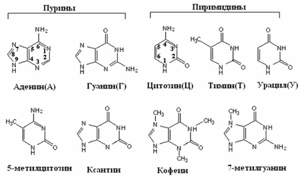 В клетках растений выявлена серия пуриновых оснований с метильными заместителями. Многие из них фармакологически активны. В качестве примера можно привести кофейные зерна, содержащие кофеин (1,3, 7-триметилксантин), чайный лист, содержащий теофиллин (1, 3-диметил-ксантин), и какао-бобы, в состав которых входит теобромин (3, 7-диметилксантин).