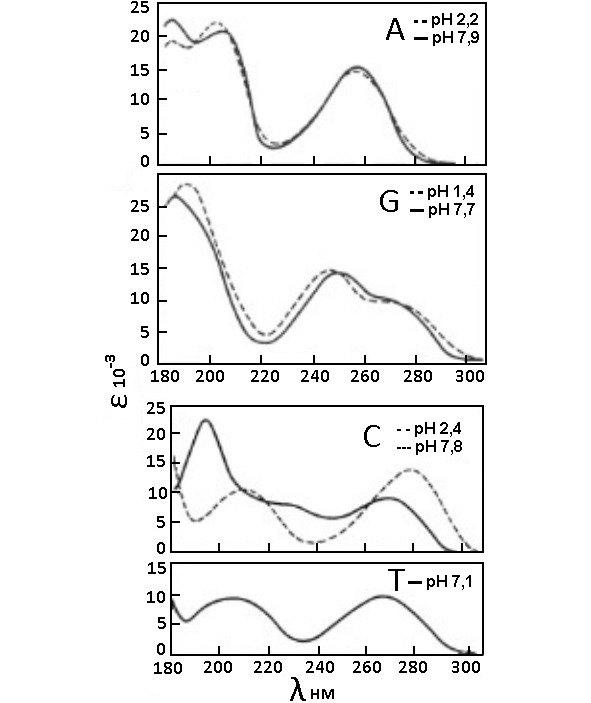 За счет системы сопряженных двойных связей все азотистые основания поглощают в ультрафиолетовой части спектра. Спектр поглощения – график распределения оптической плотности в зависимости от длины волны. Для каждого азотистого основания свой спектр поглощения, по нему можно различить растворы различных азотистых оснований или соединений в состав которых входит азотистое основание (нуклеотиды), но максимум поглощения у всех совпадает при длине волны 260 нм. Это позволяет легко и быстро определять концентрацию как азотистых оснований, так нуклеотидов и нуклеиновых кислот. Спектр поглощения также зависит от рН раствора (Рисунок 33).
