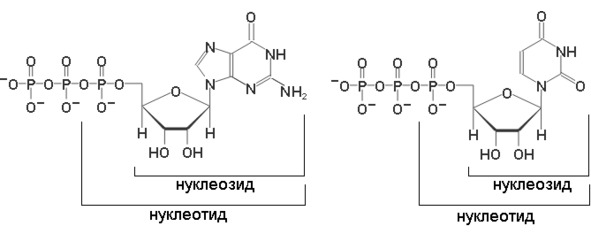 Молекулы нуклеозидов построены из пуринового или пиримидинового основания, к которому (β-связью присоединен углевод (обычно D-рибоза или 2-дезоксирибоза) в N9 или N1‒положении соответственно. Таким образом, адениновый рибонуклеозид (аденозин) состоит из аденина и D-рибозы, присоединенной в положении N9; гуанозин – из гуанина и D-рибозы в положении N9; цитидин – из цитозина и рибозы в положении N1; уридин – из урацила и рибозы в положении N1. Таким образом в пуриновых нуклеозидах (нуклеотидах) азотистое основание и сахар связаны 1—9 β гликозидной связью, а в пиримидинах – 1—1 β гликозидной связью.