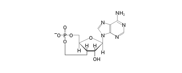 Сигнальная (цГМФ, цАМФ) (Рисунок 35). Циклический AMФ (3́-, 5́-аденозинмонофосфат, цАМФ) – медиатор различных внеклеточных сигналов в клетках животных – образуется из АТФ в результате реакции, катализируемой аденилатциклазой. Активность аденилатциклазы регулируется комплексом взаимодействий, многие из которых инициируются через рецепторы гормонов. Внутриклеточная концентрация цАМФ (около 1 мкмоль/л) на 3 порядка ниже концентрации ATФ. Циклический цГМФ (3́-, 5́-гуанозинмонофосфат, цГМФ) служит внутриклеточным проводником внеклеточных сигналов. В некоторых случаях цГМФ выступает в роли антагониста цАМФ. цГМФ образуется из ГТФ под действием гуанилатциклазы – фермента, имеющего много общего с аденилатциклазой. Гуанилатциклаза, как и аденилатциклаза, регулируется различными эффекторами, в том числе и гормонами. Как и цАМФ, цГМФ гидролизуется фосфодиэстеразой до соответствующего 5́-монофосфата.