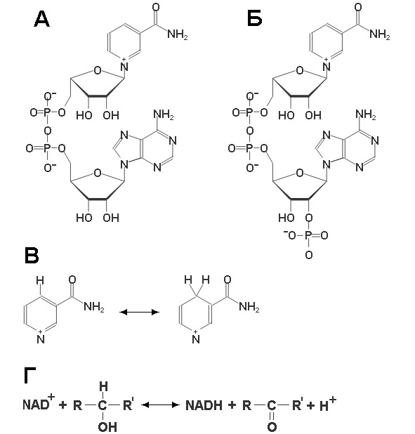 Рисунок 36. Никотиновые коферменты. А-структура NAD, Б-структура NADP, В-механизм активности никотиновой кислоты, Г-механизм работы никотиновых коферментов