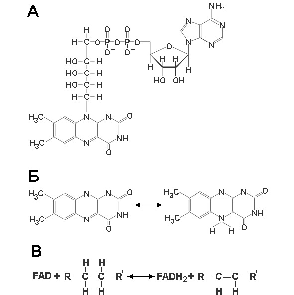 Рисунок 37. Флавиновые коферменты. А-структура FAD, Б-механизм активности никотиновой кислоты, В-механизм работы флавиновых коферментов
