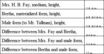 These measurements were taken by means of an upright staff with a cross piece at right angles, and I was assisted by a gentleman who is a thorough skeptic. Care was taken to have the forms stand perfectly upright, so that there could be no mistake as to accuracy.
