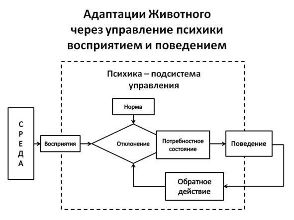 Психика есть высшая форма адаптации многоклеточных Животных. Анализ форм приспособления при управлении приводит к выводу, что такая система обязана обладать индивидуальной приобретенной в опыте (памятью) о наилучшем управлении восприятием и поведением организма в отношении ситуаций среды [Там же, с. 63—64]. информацией