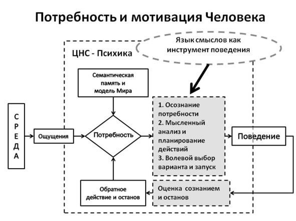 – (Ч) МОТИВАЦИЯ ПОВЕДЕНИЯ ПРИ БАЗОВЫХ ПОТРЕБНОСТЯХ С ИСПОЛЬЗОВАНИЕМ СОЗНАНИЯ, МЫШЛЕНИЯ И ИЗВЕСТНОЙ ИНФОРМАЦИИ: , появившаяся потребность, в том числе подсознательное предвкушение или беспокойство запускает (волевое) сознание для обеспечения подготовки поведения, или при опережении потребности сознание запускается от подсознания. Запущенные процессы сознания мы именуем . Но запуск базовой потребности у Человека может производиться с участием сознания, информации и элементов мышления в сочетании со срочным действием среды. Потому сознание может принимать участие и в запуске, и в снятии потребности. В общем случае сознание оценивает собственную потребность, обеспечивает на основе языковой модели Мира мысленное проектирование поведения; далее сознание запускает снимающее поведение и осуществляет его контроль, см. 2.13.13.; при наличии приобретенного опыта, включая и языковую универсальную модель Мира (Человека) воздействии среды в сложных случаях и возможности задержки потребности, мотивацией