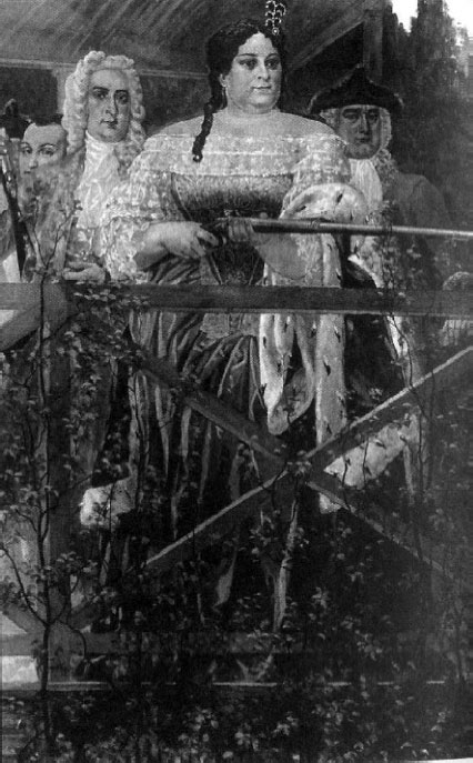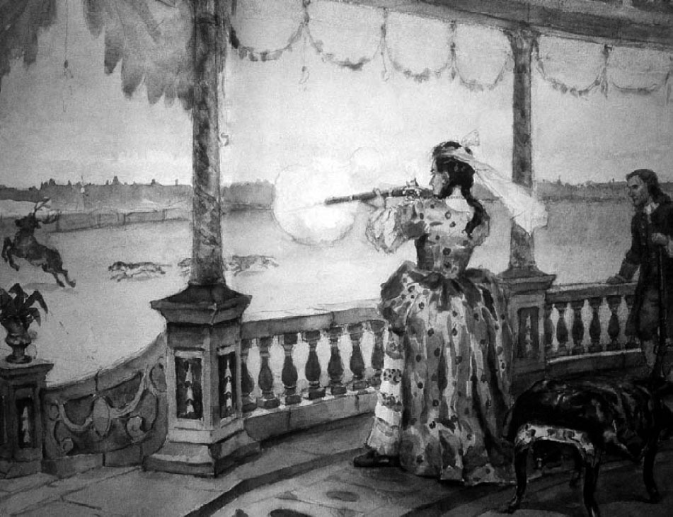 Рис. 2. Императрица Анна Ивановна в Петергофском «Темпле» стреляет оленей (В. Суриков, по: Кутепов, 1895–1911)