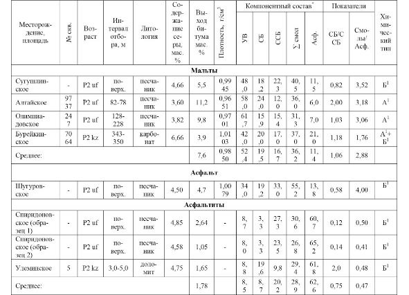 Плотность мальт изменяется от 0,965 до 0,9945 г/см, содержание серы в них составляет 2,43—6,66%. Наиболее высокое содержание серы 6,66% характерно для Бурейкинского битума (скв. 7064) из карбонатных отложений казанского яруса [37].
