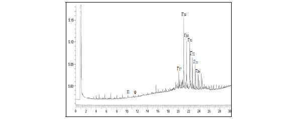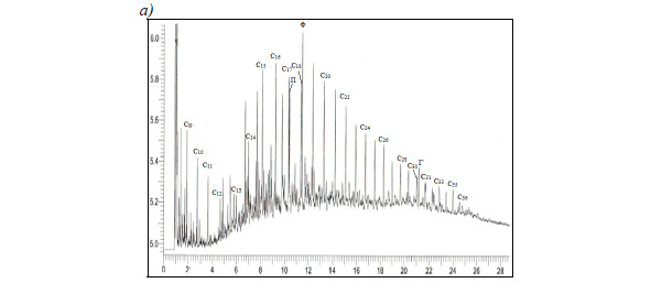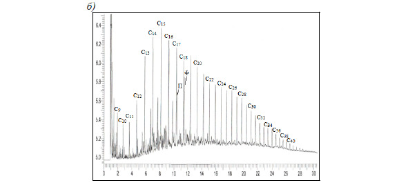 На хроматограммах этих битумов (рис. 2) видны четкие пики, указывающие на присутствии в достаточно высоких концентрациях н-алканов состава С10-С36 и выше, с преобладанием гомологов выше С20 [37].