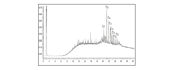 Рис. 2. Хроматограмма битума из поверхностных отложений Шугуровского месторождения (тип Б1)