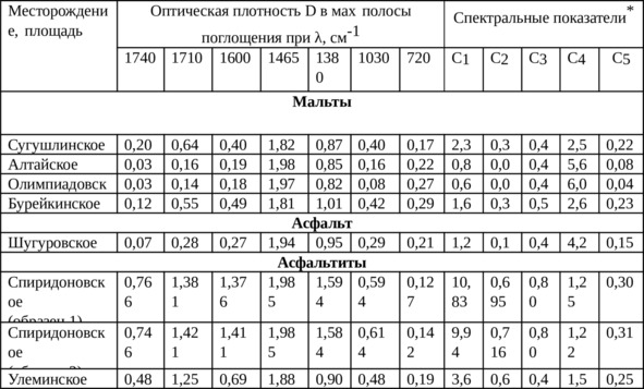 Парафинистые битумы Алтайского и Олимпиадного месторождений отличаются более высокими значениями показателя алифатичности С4 = 5,60—6,02 и наименьшими значениями показателей ароматичности С1=0,66—0,82, окисленности С2 = 0,074—0,085 и осерненности С5=0,044—0,082, что согласуются с данными ГЖХ-анализа этих битумов. Промежуточное положение по спектральным параметрам занимают битумы Шугуровского, Сугушлинского и Бурейкинского месторождений. Степень разветвленности парафиновых структур в ряду исследованных битумов, за исключением Спиридоновского асфальтита, изменяется в достаточно узких пределах С3 = D1380/D1465 (0,42—0,56). Для Спиридоновского битума этот показатель несколько выше С3 = 0,80 [37].