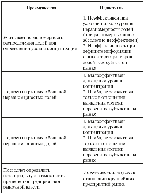 Таким образом, чем ниже волатильность цены на товар, предельные издержки самой крупной фирмы и количество фирм-конкурентов, присутствующих на рынке, тем выше уровень рыночной концентрации. Вместе с тем уровень рыночной концентрации также тем выше, чем больше размер (ранг, активы) самой крупной фирмы на рынке, чем большую рыночную долю она имеет в реализации конкретного товара на релевантном рынке, чем большее превышение размера рыночный цена на этот товар над предельными издержками самой крупной фирмы и чем выше предельное изменение спроса на этот товар на этом рынке.