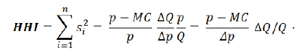 По Л. Кабралю имеется прямая зависимость между уровнем рыночной концентрации и рыночной властью[21]. С применением общей модели Курно индекс Лернера может быть выражен через коэффициент Херфиндаля-Хиршмана (HHI):