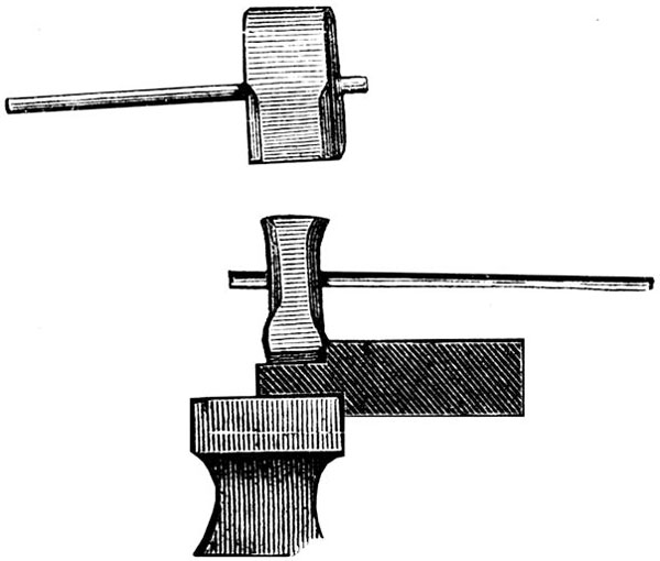 Мы уже говорили, что удары кувалдою не всегда производятся непосредственно по металлу; когда, например, нужно придать поверхности известное очертание, то на помощь кувалде употребляется гладилка, которая и передает металлу удары кувалды.