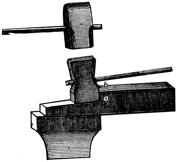 При проковке меди на наковальне не следует также упускать из виду относительную мягкость этого металла в нагретом состоянии сравнительно с железом и сталью. Под ударами молота медь расплющивается, и потому из предосторожности лучше всего производить проковку меди деревянным молотком, сделанным из какого-либо твердого и нехрупкого дерева.