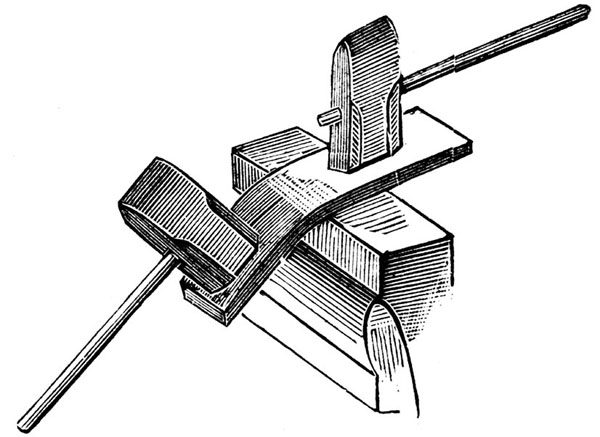 При загибании толстых железных полос весьма редко удается придать изгибу правильную форму, то есть чтобы ребра образовали прямой угол и в месте сгиба не образовалось бы закругления, не говоря уже о том, что в месте сгиба толщина полосы может быть неодинакова с остальною толщиною полосы. Чтобы этого не могло случиться, лучше всего прежде изгибания сначала осадить полосу по линии сгиба и затем уже приступить к самому изгибанию. Что касается изгибания железа под острым или тупым углами, то для этого необходимы шаблоны, на которых и производится желаемый сгиб.