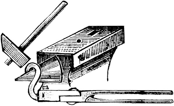 Пробивание дыр. Дыры пробиваются в нагретом железе посредством пробойника, но это необходимо делать осторожно и наносить удары по пробойнику не очень сильно, особенно в мелких вещах, чтобы не могло произойти трещины в металле. Если возможно, то лучше всего такое пробивание делать в сквозных дырах с двух сторон, а сами дыры выправить оправкою.