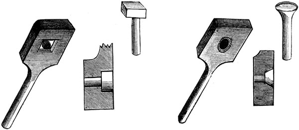 Отковка болтов и гаек. К числу простейших работ, однако требующих известной точности и аккуратности, принадлежит отковка железных болтов и гаек. Необходимым пособием для отковки небольших болтов, заклепок и гвоздей служит гвоздильня. Она состоит из металлической стальной или железной со стальною наваркою доски с ручкой. Посредине доски, называемой формой, сделано углубление, или гнездо, соответствующее форме и очертанию болтов и заклепок, как это видно на рис. 36 и 37.
