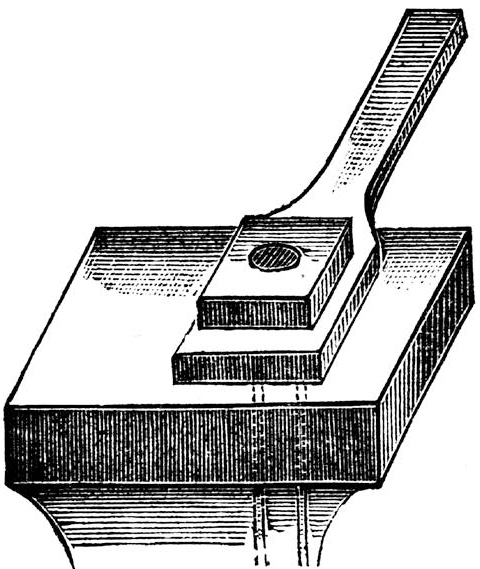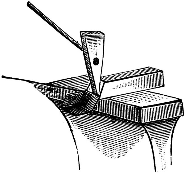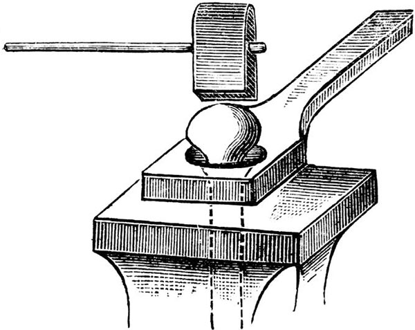 Изготовление болта с коническою потайною головкою. Отрубив кусок болтового железа длиною несколько более предполагаемой длины готового болта, накаливают конец его в горновом гнезде и затем осаживают настолько, чтобы из полученного утолщения этого конца могла образоваться головка болта. Тогда стержень нагревают до белокалильного жара и, захватив его клещами за грушевидное утолщение, быстро опускают конец болта в наложенную на наковальню гвоздильную форму, как показано на рис. 39. Затем часто ударяют ручником и кувалдою по утолщению; последнее, раздавшись, заполнит все пустоты гнезда гвоздильни. Когда эта работа окончена, поднимают гвоздильню за рукоятку и, ударив хвостом болта о наковальню, вынимают болт и подвергают его окончательной отделке.