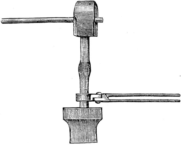 Вороток имеет много различных применений в практике. Для отковки его берут длинный круглый стержень, откованный из доброкачественного железа, отмерив требуемую длину с прибавкой 12–16 см против размера воротка, помещают последний в горн так, чтобы средина его была зарыта в уголь, а концы находились вне кучи горящего угля. Нагреть надо только середину стержня до белокалильного жара, а затем вынимают его из горна, захватив клещами за нагретое место, и быстро опускают в чан с холодною водою оба конца железного стержня, из которых должны быть откованы ручки. Затем стержень, как показано на рис. 41, осаживают посредине, при помощи плоской гладилки телу воротка придают надлежащую форму и пробивают четырех- или шестигранное отверстие. Дальнейшая отделка воротка производится в тисках.