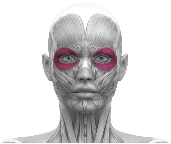Широко раскрываем глаза, потом прищуриваемся (приподнимая нижнее веко). Под пальцами чувствуется движение (сужение) мышцы.