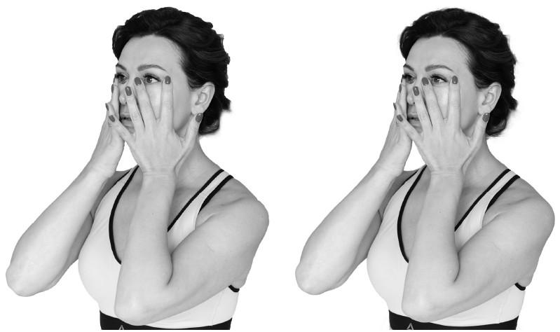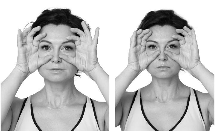 В момент выполнения упражнения под ладонями ты будешь чувствовать движение мышц. Убери руки, сравни ощущения. Посмотри в зеркало. Видишь? Часто уже после первого выполнения упражнения приподнимается угол глаза и кончик брови, как у тебя сейчас.