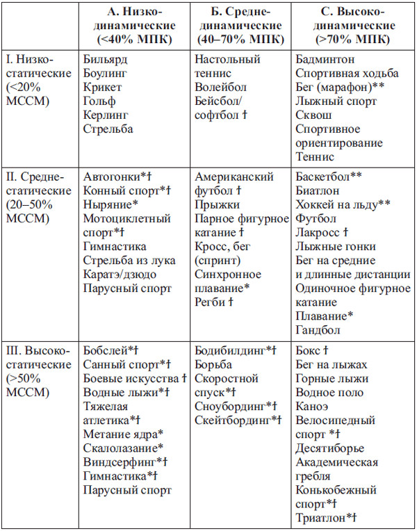 Примечание: (+) – умеренные нагрузки, умеренные сердечно-сосудистые изменения; (++) – значительные нагрузки, значительные сердечно-сосудистые изменения; (+++) – предельные нагрузки, предельные сердечно-сосудистые изменения; * – вид спорта с высоким риском тяжелого повреждения или смерти для спортсмена и/или зрителей в случае обморока; ϯ – вид спорта с повышенным риском столкновения спортсмена.