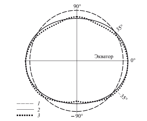 Рис. 2. Представления о форме поверхности Земли (по Г.Н. Каттерфельду): 1 — сфера; 2 — эллипсоид вращения; 3 — геоид (кардиоид)