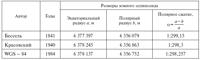 В настоящее время основные геометрические параметры общеземного эллипсоида определяются более точными методами с использованием искусственных спутников Земли. Для сравнения в табл. 2 приведены размеры земного эллипсоида, определенные Бесселем, Красовским и в глобальной геоцентрической системе координат WGS – 84 (World Geodetic System, 1984).