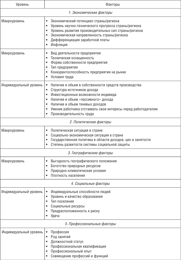 Факторы, влияющие на размеры доходов населения и их различия, можно объединить в группы. Причем выделенные факторы могут оказывать влияние на разных уровнях: макроуровне, микроуровне и уровне отдельного индивида (так называемые индивидуальные факторы):