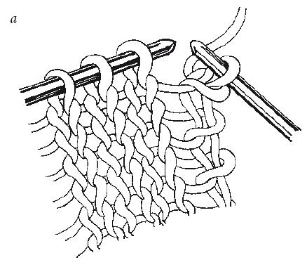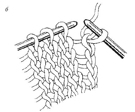 При вязании полотна первую кромочную петлю просто переносят, не провязывая, на правую спицу. Последнюю кромочную петлю можно провязать лицевой – тогда получится узелковый край; или изнаночной – образуется ровная косичка из кромочных петель (рис. 9 а, б).