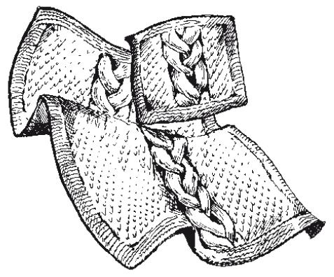 Полотно сложите пополам и выполните боковой шов. Из пряжи скрутите 2 шнура длиной 40 см и проденьте сквозь отверстия мережек. Внутрь чехла вложите подушку-валик подходящего размера и затяните шнуры по бокам чехла. Концы шнуров завяжите бантиками (рис. 16).