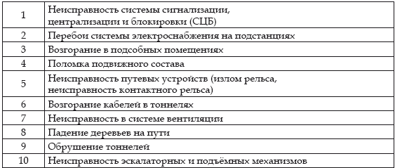 1) сбои технического характера, связанные с износом или старением инфраструктуры метро (старение кабелей, коррозия металлических сооружений и т. д.);