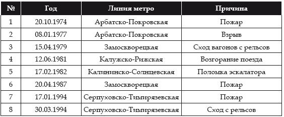 Кроме этих сбоев, представляется целесообразным рассмотреть значительные аварии и катаклизмы в метро, которые принесли значительный ущерб инфраструктуре метро и повлекли за собой человеческие потери