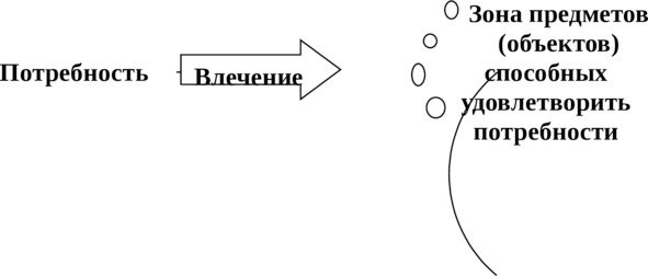 Замысел деятельности возникает, если есть потребности, подкрепленные определенными побуждениями (мотивами: потребностями, интересами, стремлениями, влечениями и др.). В этом случае возникает зона объектов (предметов), способных удовлетворить эти потребности, т.е. возникает определенная, но все еще не конкретизированная мотивация. Рис.6.6