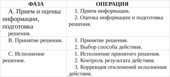 Принятие решения занимает в структуре деятельности центральное положение. Основная функция принятия решения – снятие (или уменьшение) неопределенности и определение способов действия в конкретных изменяющихся условиях деятельности. Это своего рода «мост» от фазы opиентировки в деятельностных ситуациях к фазе построения и осуществления исполнительских действий, т.е практической деятельности.