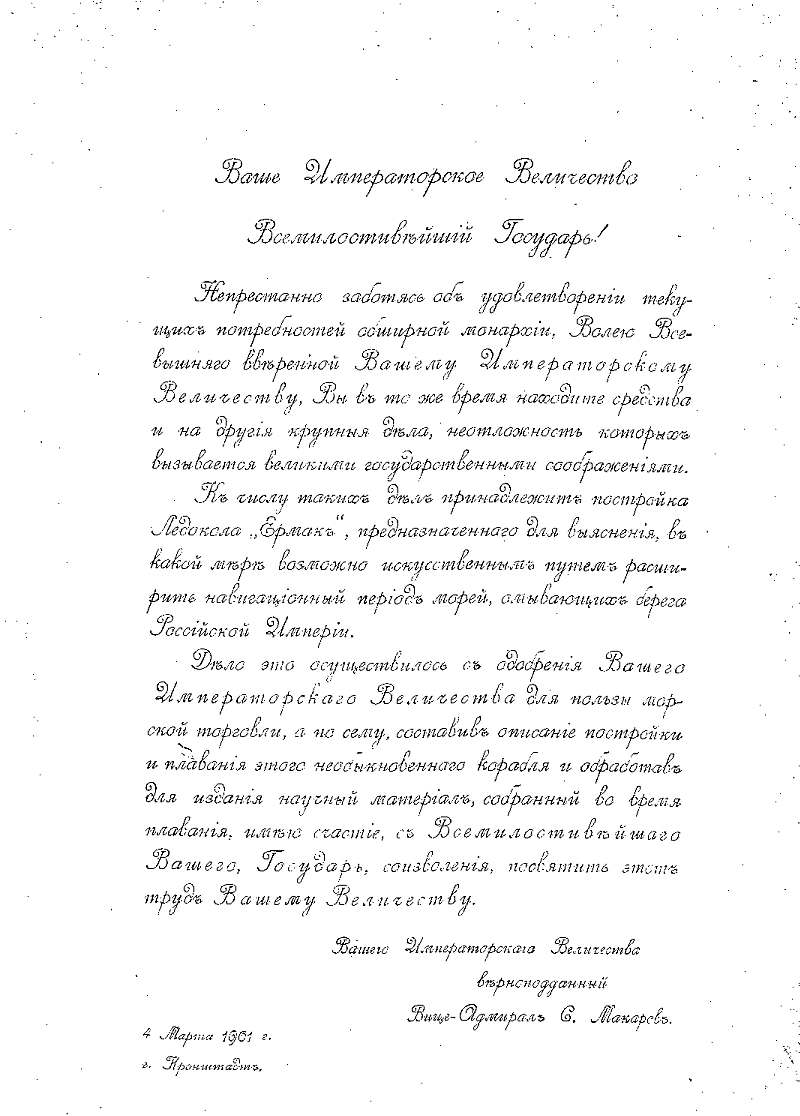 Постройка «Ермака» есть событие в русской жизни, которое возбудило немалый интерес, и за последние 2 года имя ледокола «Ермак» встречалось в газетах очень часто. Большинство русской публики отнеслось к начатому мною делу доброжелательно и говорило, что давно пора начать бороться с препятствиями, которые ставит нам природа; но были и такие, которые считали, что деньги, истраченные на постройку «Ермака», брошены даром.