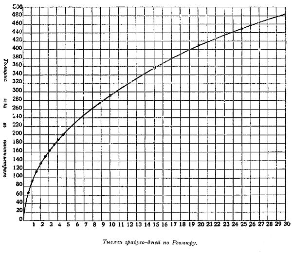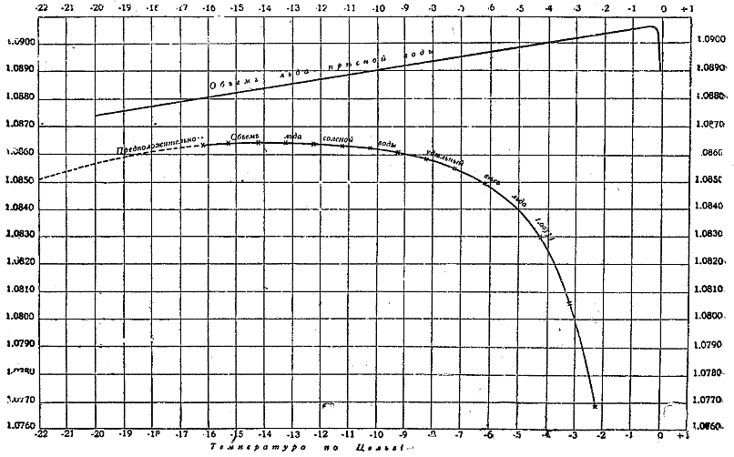 Предположим, что в конце зимы лед имеет толщину 2 м и что на поверхности он имеет температуру −38°, внизу температуру воды −2°, а в середине среднюю температуру −20°. При этом условии верхний лед находится в состоянии, соответствующем объему 1083, средний лед 1086, а нижний 1077. Допустим теперь, что началась оттепель и поверхность льда, толщиною в несколько дюймов, приняла температуру, близкую таянию −2°. Этой температуре соответствует объем 1077; следовательно, лед на поверхности должен был сжаться почти на 1 %, в то время как средняя толща осталась в прежнем объеме. Это обстоятельство вызывает трещины на поверхности, и Вейпрехт говорит (стр. 47), что весною нельзя найти и 1 кв. м поверхности льда без трещин.