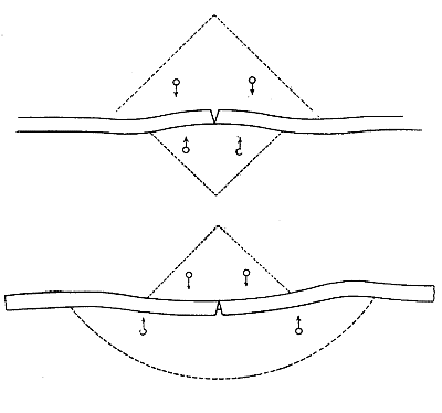 О глубине тороса можно судить по вышине его над водою. Торос представляет из себя кряж гор с некоторыми вершинами, и 18–23 фута, вероятно, есть высота вершин, а не всего кряжа. Предположим, однако же, чтобы не ошибиться, что кряж тороса имеет вышину 18 футов, и зададимся вопросом, как глубоко такой торос простирается вниз. Вейпрехт говорит, что в морском льде отношение высоты надводной части к подводной изменяется в пределах 1:10 и 1:3; в среднем он принимает 1:5. если допустить, что набивной лед имеет равную толщину, то вышина 18 футов над водою будет соответствовать 90 футам под водою. Но, по отношению к торосу, это не так. Торос в сечении имеет вид треугольника. Допустим, что стороны его идут под углом 45°, получим, что при высоте 18 футов и основании 36 футов площадь треугольника будет 324 кв. фута. Для поддержания веса этого льда следует под ним нагромоздить треугольник, площадью в 5 раз большею, т. е. 1620 кв. футов. такой треугольник, при той же покатости боков, будет иметь высоту 40 футов и основание 80 футов. Прибавим 12 футов толщины сплошного льда, и мы получим глубину тороса в 52 фута (рис. 3). Сплошной лед, представляющий связь тороса, будет в центре нагромождения претерпевать большее давление сверху, а по бокам будет большее давление снизу. Поэтому поверхность льда примет выгнутую форму, что и наблюдал нансен. Когда начинается таяние, то во впадинах у тороса скапливается вода. Наибольшей глубины торос, вероятно, достигает в момент своего образования, но затем лед начинает разравниваться. Вейпрехт (стр. 64) свидетельствует, что иногда, при полном спокойствии льда сверху, слышно его перемещение внизу. Это происходит, вероятно, вследствие движения воды под ледяным полем. Разность движения ледяного поля и воды, на которой оно лежит, т. е. течение воды, есть та сила, которая тревожит и разравнивает нижние глыбы льда.